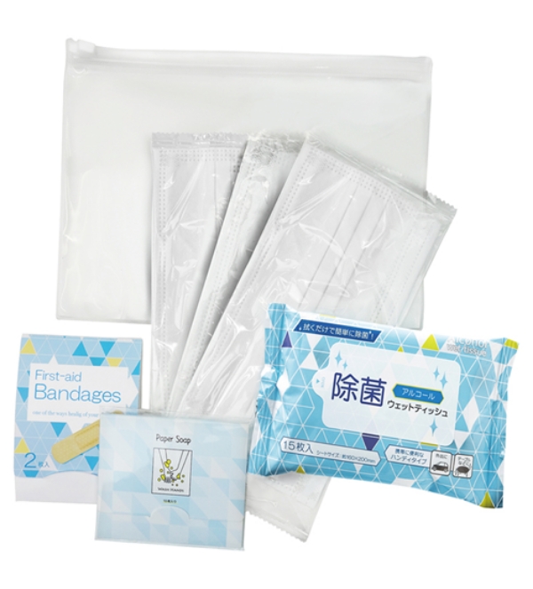 | サイズ | セット内容/ポーチ×1、マスク×3、除菌ウェットティッシュ×1、ペーパーソープ×1、絆創膏×2 |